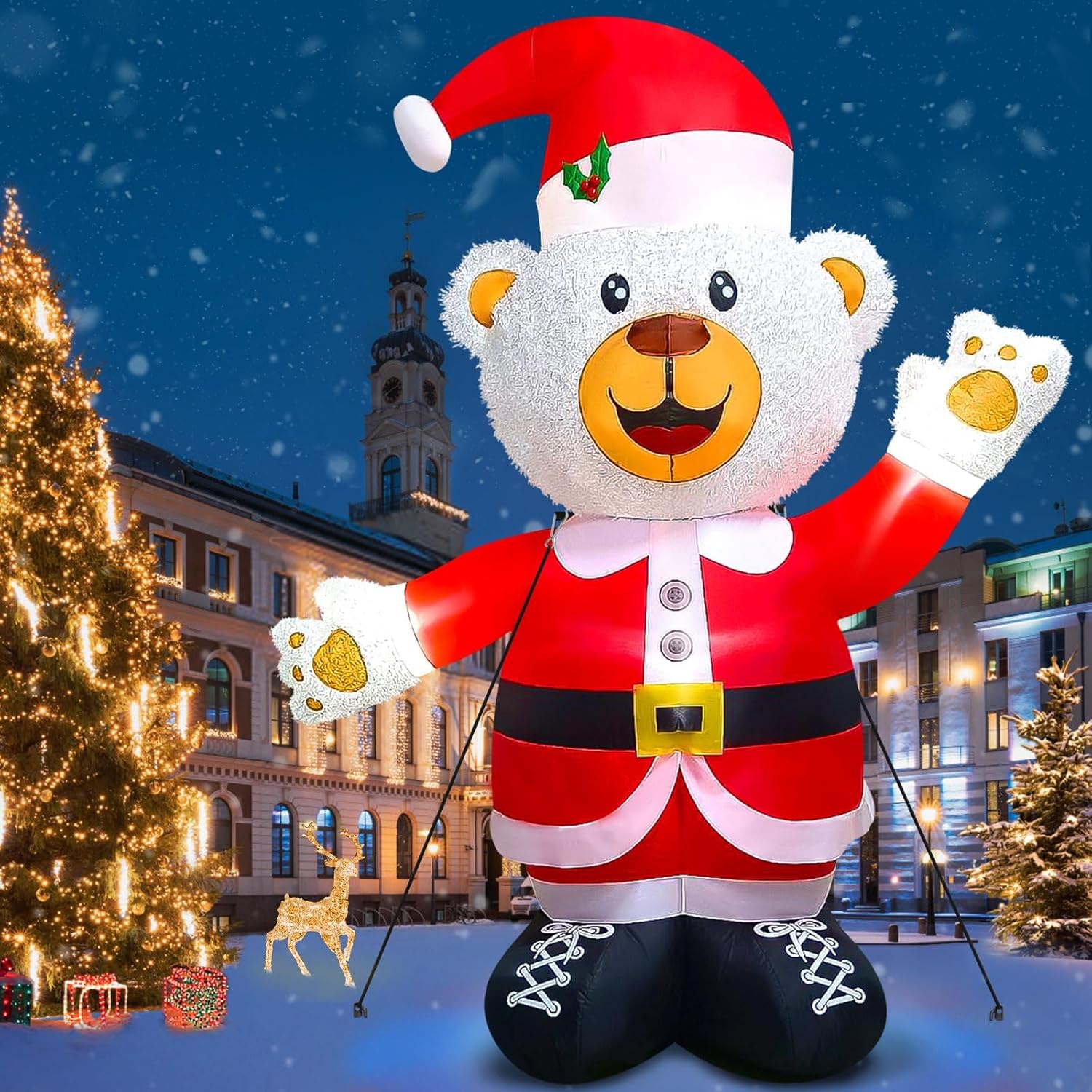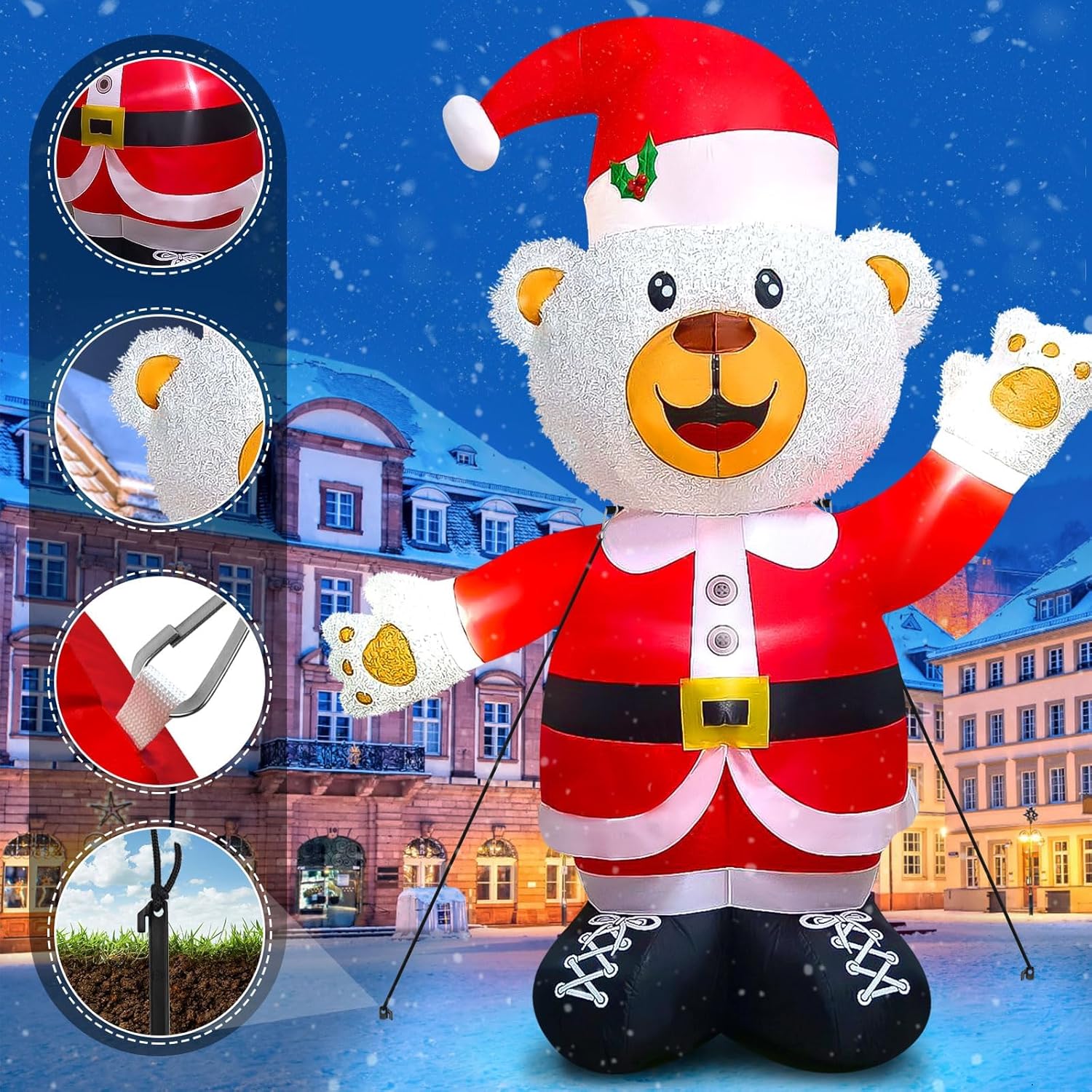 - 🎅 Fluffy Christmas Inflatables: You will receive the 8 feet cute white Christmas inflatable fluffy bear, much bigger than normal holiday inflatables. Everything needed for installation such as ground stakes, metal buckles, tethers and blower are included. Installation instructions are included, please read carefully before installation.