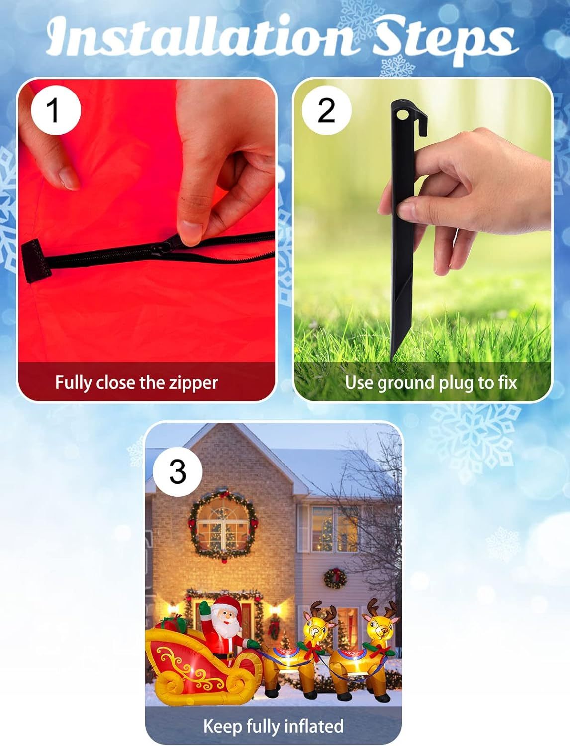 - 🔔 Install in Several Minutes: You only need to put the Christmas outdoor inflatables on a large open space and zip up the bottom of the inflatable before inflating, and it will automatically inflate immediately. At the same time, it deflates very quickly and is easy to store without taking up too much space.